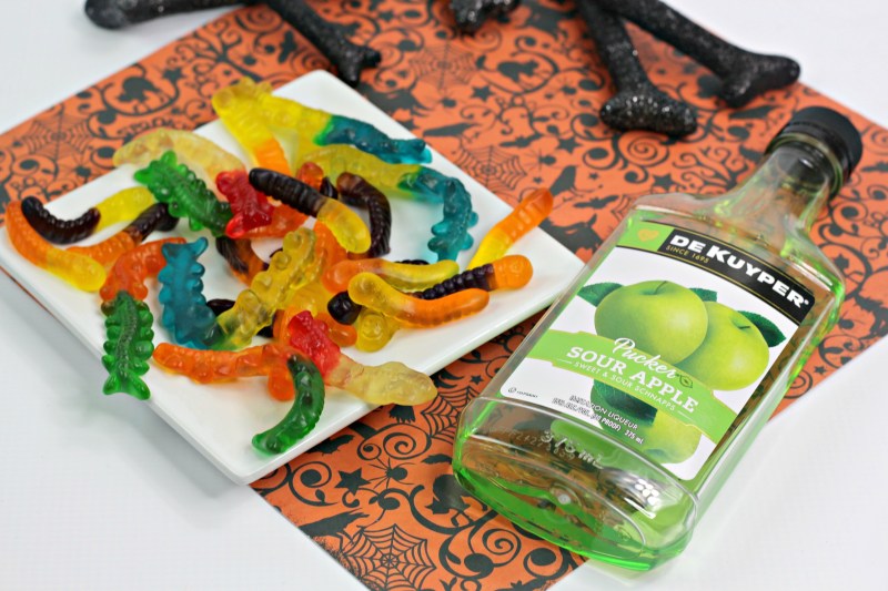 Add the liquor worms on top along with the candy zombie hand.