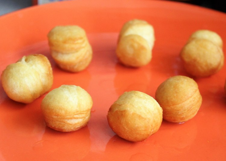 3. Gently place 4-6 of the donut rounds into the oil at a time. When one side is golden brown, use tongs to flip over and fry the other side.