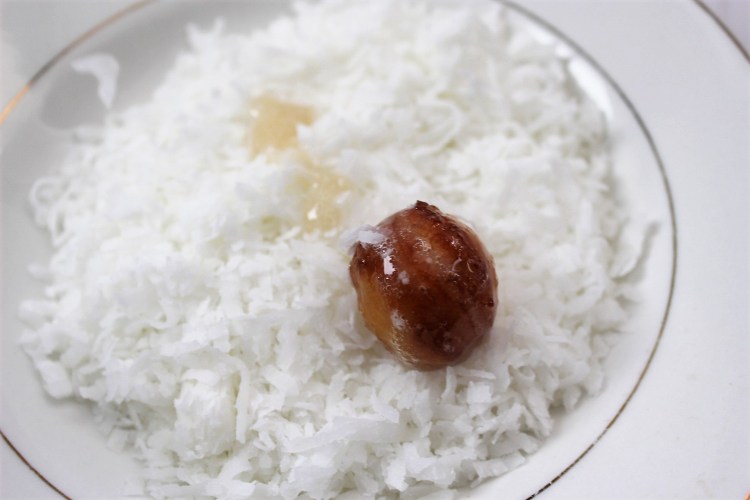 7. Dip each donut into the glaze and roll around in the coconut. Place on parchment paper to set.