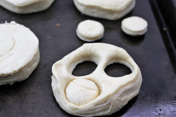 2. Take biscuits out of the can and lay them on a cutting board. Use a 1 inch round cookie cutter (or even the cap of an olive oil bottle) to cut approximately 3-4 circles from each biscuit.