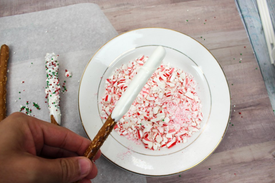 3. Pour the candy melts into a tall glass. Dip the pretzel rods into the cup and then roll in the crushed candy canes. Add sprinkles and then set aside to let harden.