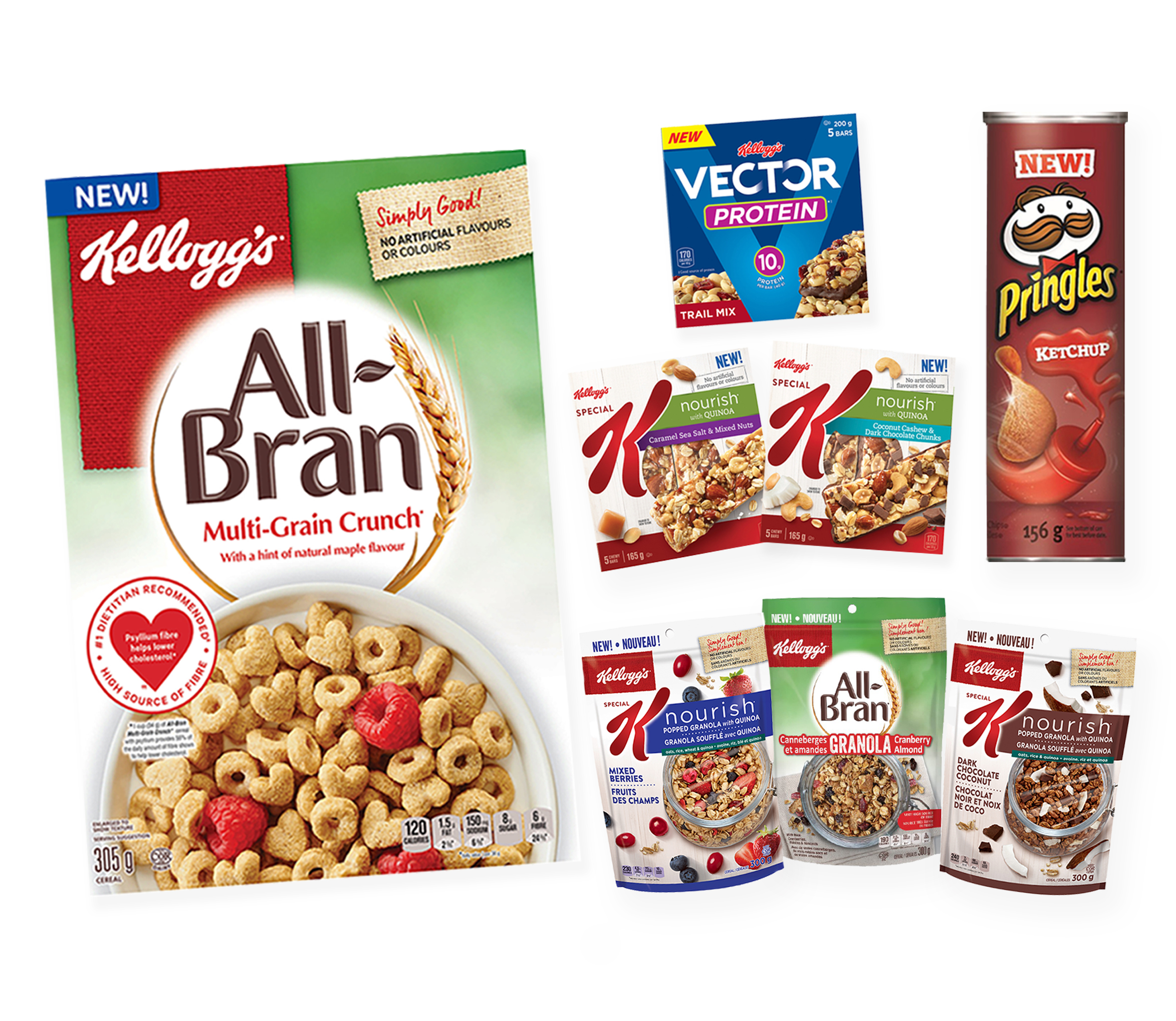 Kellogg’s Canada has a variety of new and delicious products to welcome into your home in 2017: 2 new flavours of Popped Granola with Quinoa & Special K Nourish with Quinoa Bars, All-Bran Granola, All-Bran Multi-Grain Crunch cereal, Vector Protein Bars and Pringles Ketchup Chips.