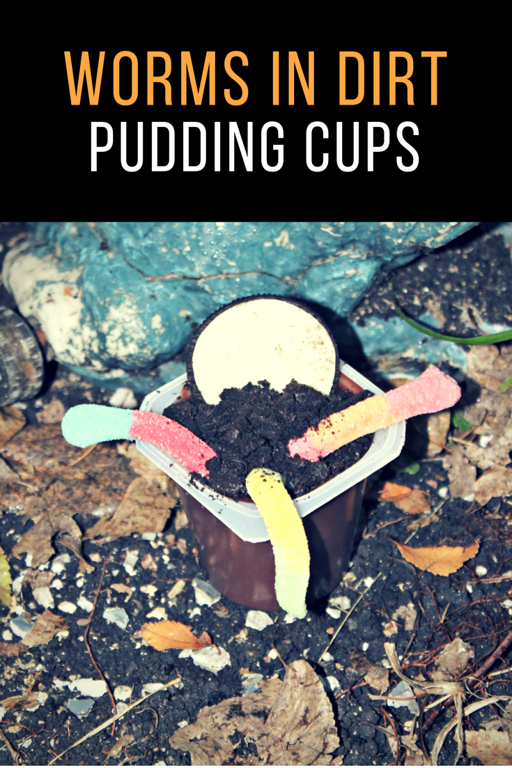 - 2. Stick gummy worms into pudding cups so only 1/2-3/4 is visible and hanging over the edge.