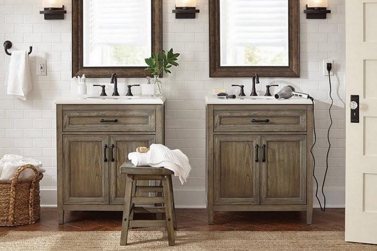 Home Decorators Collection Vanity in Driftwood Grey with Engineered Stone Vanity Top in Crystal White with White Basin | Reclaimed Wood Barstool | Deco Mirror Beaded Mirror in Bronze | 1-Light Oil-Rubbed Bronze Sconce with Hand Pained Glass Shade | Widespread 2-Handle Bathroom Faucet in Oil-Rubbed Bronze | And more…