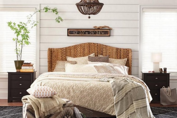 Natural King Headboard | Kallisto 3-Drawer Black Nightstand | Jada White Decorative Pillow | Karelia Khaki Acrylic Throw | Swing 4-Light Antique Bronze Foyer Pendant | Home Decorators Collection Distressed Brown Hickory Laminate Flooring | And more…