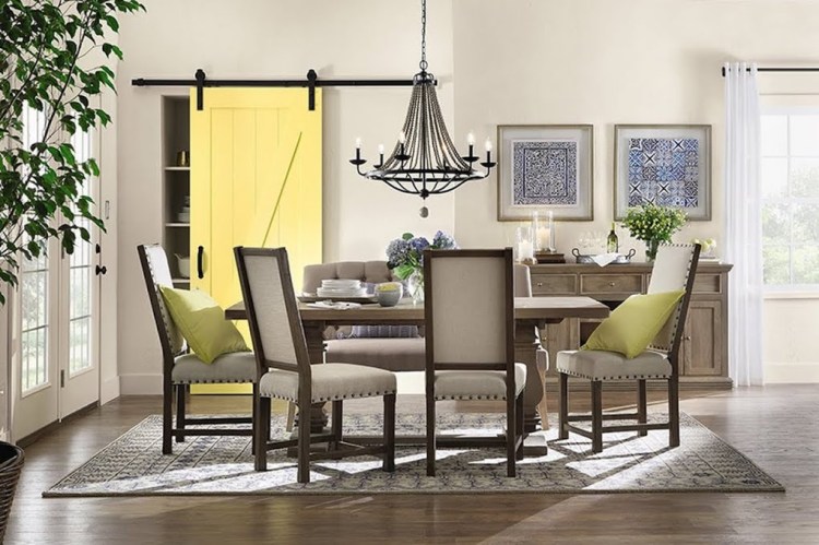 Home Decorators Collection Aldridge Antique Grey Rectangular Dining Table | Home Decorators Collection Andrew Beige Dining Chair | Valerie Beige Linen Loveseat | Nori 6-Light Dark Weathered Zinc Chandelier | Solid Pine Wood Interior Barn Door with Bronze Sliding Door Hardware | And more…
