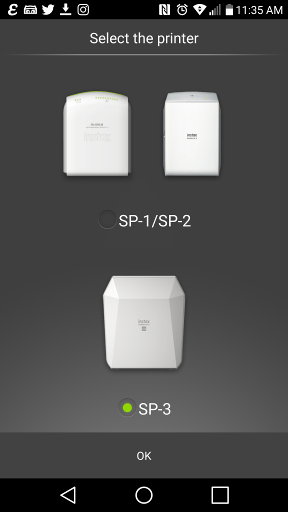 Before I could get started with my “new toy” there were a couple of steps. I really didn’t want to be in the middle of my printing groove to all of a sudden have the FUJIFILM INSTAX SQUARE SHARE SP-3 Printer die, so the first thing I did was charge the device. After that, I downloaded the Instax Share app from Google Play and select the printer I was using.