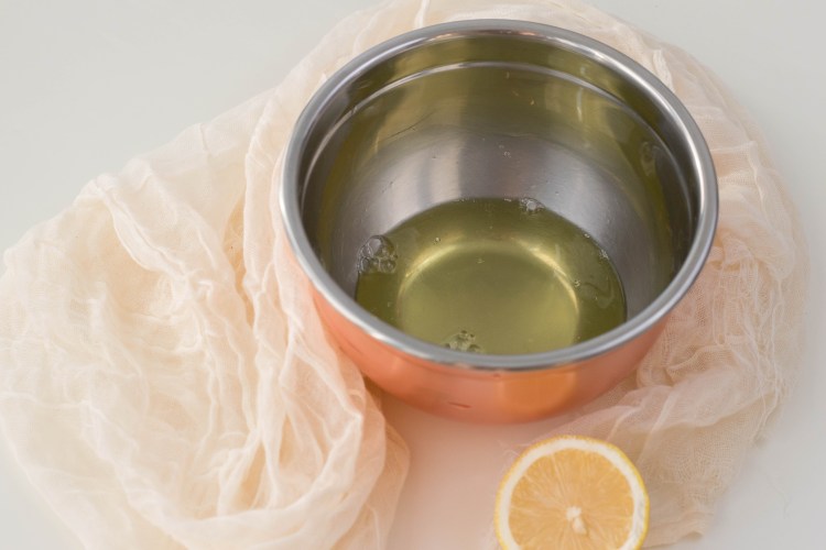 Using an electric mixer, beat eggs on medium speed. Add lemon juice.