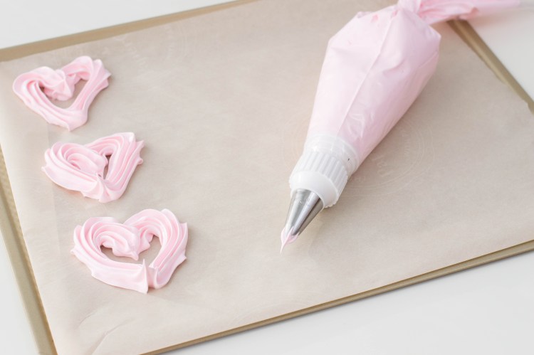 - Attach your 1M Wilton tip to a piping bag and draw out a heart outline on your lined baking sheet. Then, fill each one in.