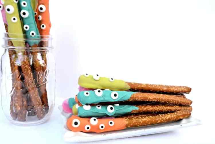 First school snack of the day must be a healthy one, especially with all the treats they’ll be having in the afternoon. I’m going to make Easy Dipped Monster Pretzels but replace the candy melts with some yogurt & food coloring.