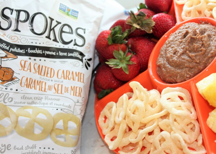 - SPOKES Sea Salted Caramel Air Puffed Potato Snacks, strawberries, pineapple, bananas, apple slices