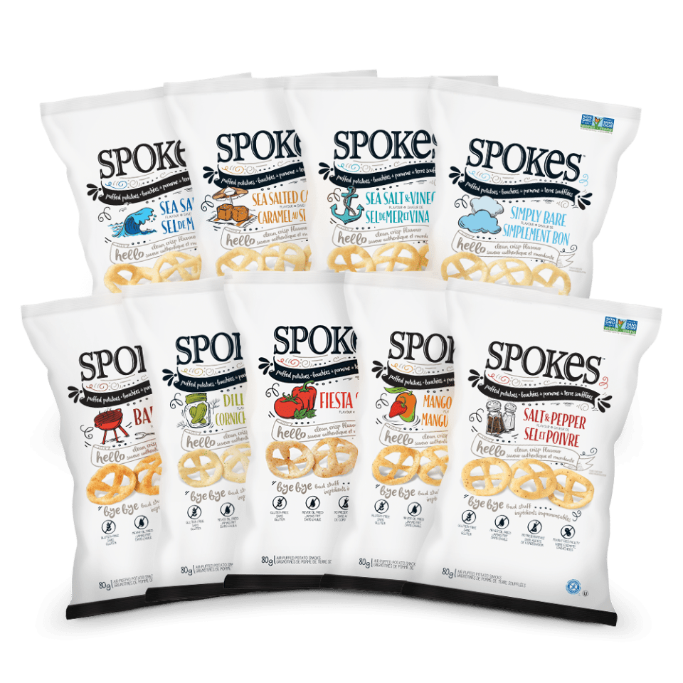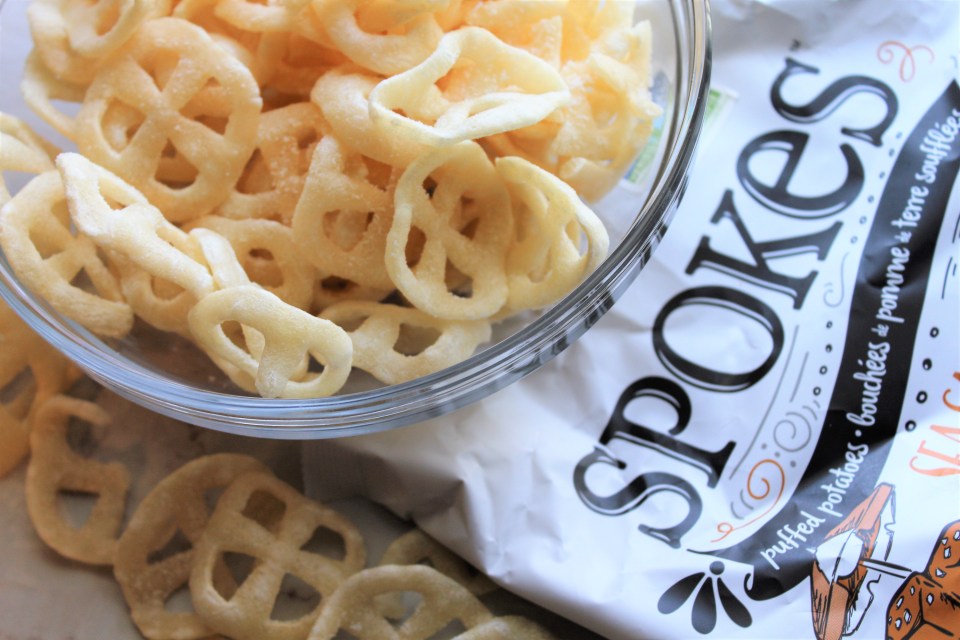SPOKES Air Puffed Potato Snacks were invented by a mom (of course) who set out to create a delicious snack the whole family can enjoy. These air puffed potato snacks are not only super light and crunchy they also only have 40 calories per cup (that’s 27% less than a regular potato chip). Each flavour is lightly misted with oils and seasoned with good-for-you simple ingredients. They are free of the 11 major allergens including peanut, dairy, gluten, wheat, soy and egg, no artificial preservatives or colours, and no trans fat or cholesterol.