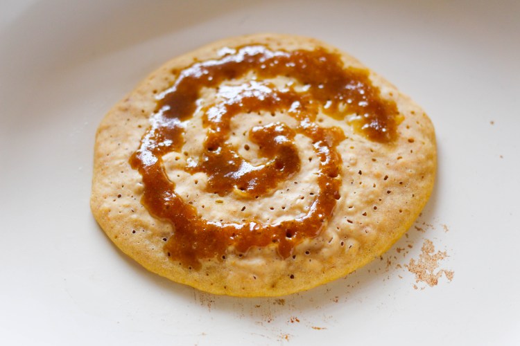 5. As the pancake starts to cook, spoon the cinnamon swirl mixture into a piping bag or plastic bag. Once the pancake is almost fully cooked on one side, snip off the end of the bag and add a swirl of cinnamon on top of the cooking pancake. Allow the cinnamon mixture to set for at least one minute before flipping and cooking full on the other side.