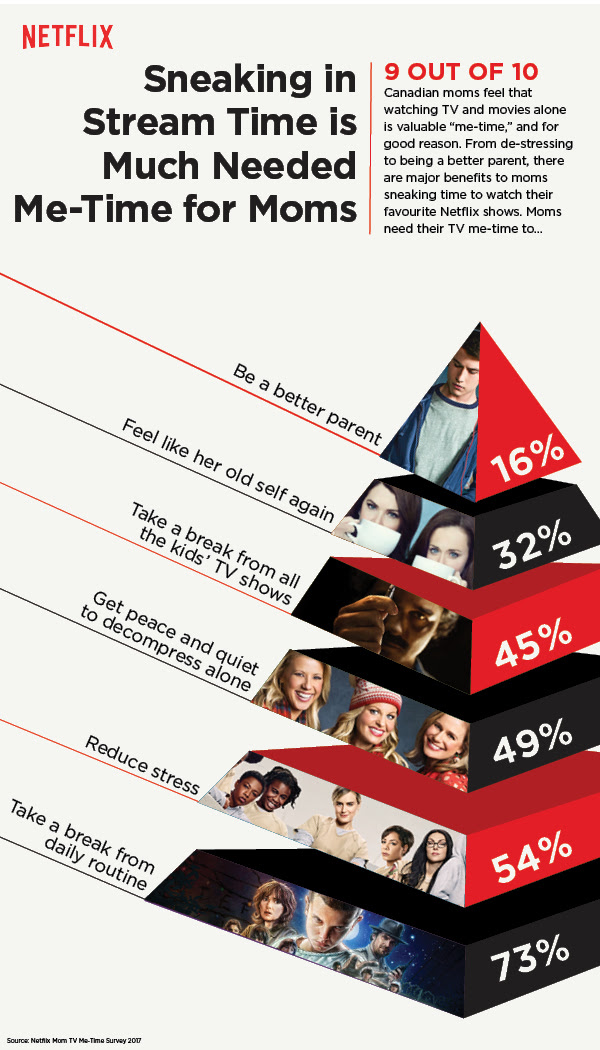 I’m not the only on either, 58% of Canadian moms admit to sneaking in some me-time any chance they get. After all, sneaking is the new binging and we’re better parents because of it. Right?!