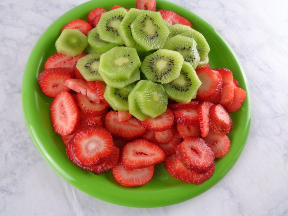 - Cut skin from kiwi fruit and wash strawberries. Cut both fruits into into thick slices.