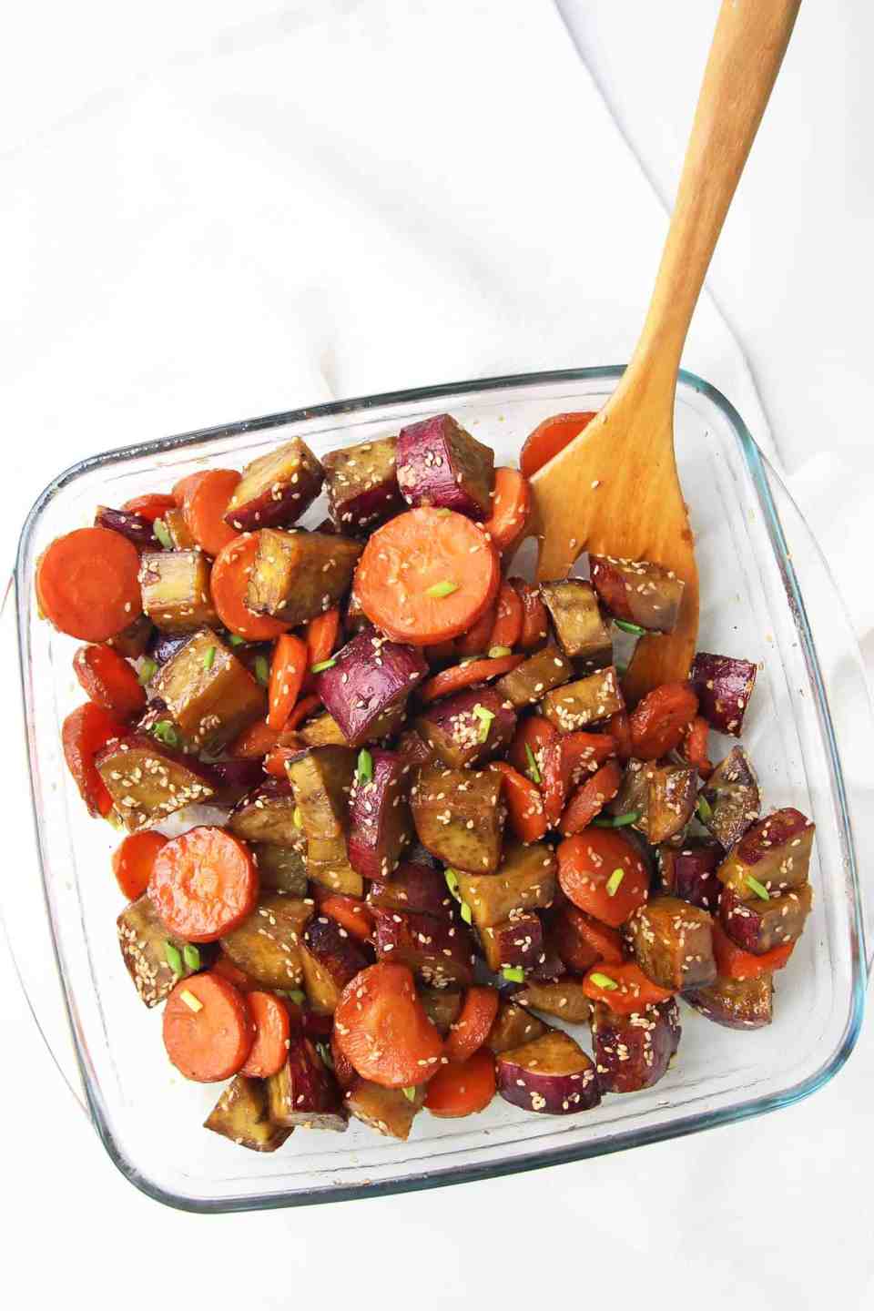 18. Honey Sesame Roasted Sweet Potato and Carrots from Leela Licious