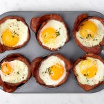 Line each muffin cup with 1 1/2-2 pieces of turkey bacon. Overlap the pieces to create a cup.